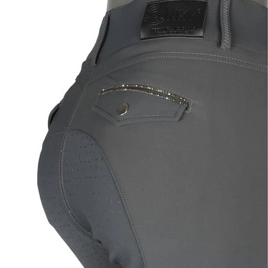 De zakken zijn afgewerkt met een band van kleine, glanzende steentjes (behalve de diepe voorzak). Het ademende stretchmateriaal met anti-pilling biedt optimaal draagcomfort en gaat lang mee. De tailleband is voorzien van twee haak- en oogsluitingen. De riemlussen zijn afgewerkt met gunmetalkleurige flatlockstiksels een metalen merkplaatje. Het siliconen zitvlak maximaliseert de stabiliteit op het zadel.