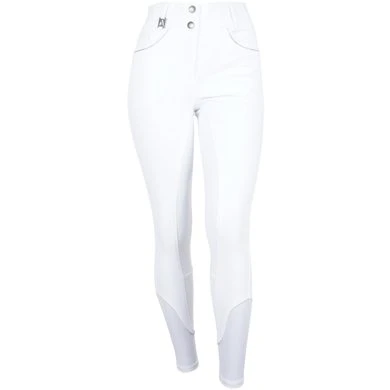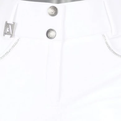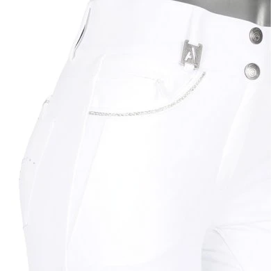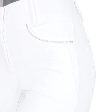 Deze mooie, stevige rijbroek beschikt over diepe steekzakken en een muntzakje met nylon rits aan de voorzijde en vier opgestikte zakken (twee grote en twee kleine) aan de achterzijde. De zakken zijn gedecoreerd met glanzende, gevlochten tape en een patroon van zilveren strass steentjes.
