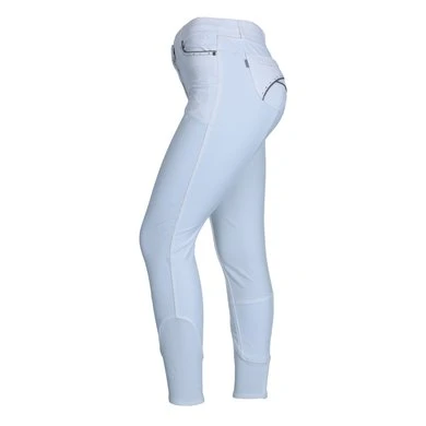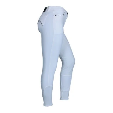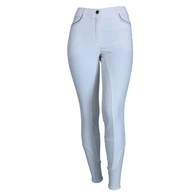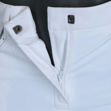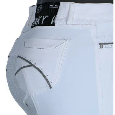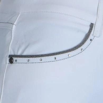 Stijl en comfort worden gecombineerd in deze fijne rijbroek. Het technische materiaal Aqua-X heeft een groot absorberend vermogen, droog snel en helpt bovendien bij het reguleren van de lichaamstemperatuur. Andere voordelen van Aqua-X zijn de water- en vuilafstotende werking en de beschermende functie tegen UV-straling. Deze variant van de ANKY® rijbroek Decorated heeft een ¾ stoffen zitvlak met een siliconenprint voor extra grip. Het slim fit model heeft jeanszakken aan de voorkant en opgestikte zakken aan de achterkant. De zakken zijn stijlvol afgewerkt met een glinsterend biesje, zilveren sierstiksels en kleine imitatiediamantjes voor een touch of elegance. De broek heeft een comfortabele tailleband met riemlussen. Het onderste gedeelte van de broekspijp is gemaakt van gebreid Lycra, zodat de stof comfortabel om de enkel sluit. Samenstelling: 77% nylon, 16% Aqua-X, 7% Lycra. Machinewasbaar op 30°C.