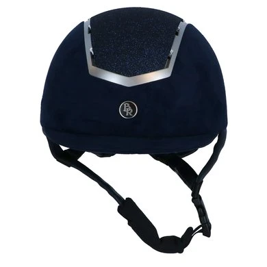 De BR rijhelm Sigma Microfiber Glitter VG1 heeft een lichtgewicht schaal van stevig ABS materiaal bekleed met microfiber. De top is verfraaid met glittermateriaal voor een verfijnde uitstraling. De zilverkleurige rand is voorzien van twaalf ventilatieopeningen. Deze zorgen samen met de binnenvoering voor een goede vochtregulatie en optimale ventilatie. De voering van Cooldry gecombineerd met mesh droogt snel en houdt het hoofd koel. De voering is volledig uitneembaar en kan in de wasmachine gewassen worden op 40°C. De helm is uitgerust met een verstelbare 6-punts kinband afgewerkt met stijlvol synthetisch leder. De kinband is voorzien van een quick release gesp en een zachte kinbeschermer van Cooldry materiaal. De helm voldoet aan de CE VG1 01.040 2014-12 veiligheidsnormering. De helm wordt geleverd met drie voeringen in verschillende maten. Zo kan eenvoudig een perfecte pasvorm verkregen worden.