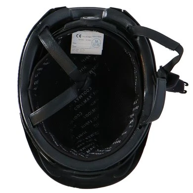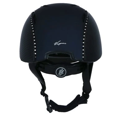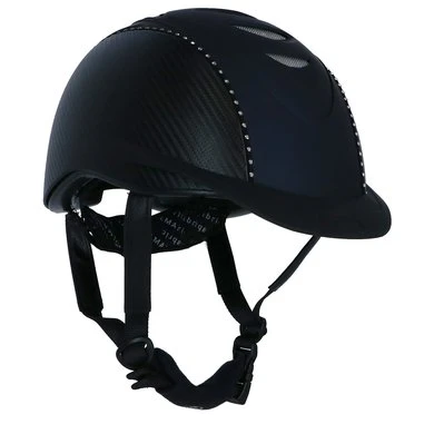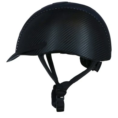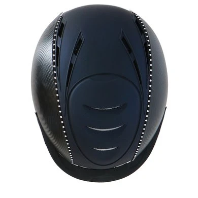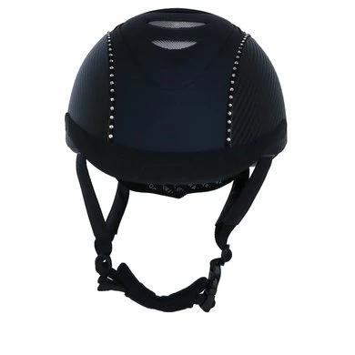 Lichtgewicht BR rijhelm met een comfortabele pasvorm en een aerodynamische vormgeving. De helm is aan beide zijden bekleed met Carbon. Twee zwarte biezen met Swarovski® kristallen over de gehele lengte geven de helm een luxe uitstraling. De drie fijnmazige, zilverkleurige stalen ventilatieroosters aan de voorzijde en de diverse ventilatieopeningen aan de bovenzijde zorgen voor een uitstekende ventilatie. De Coolmax® voering van het interieur werkt verkoelend en droogt snel. De voering is volledig uitneembaar en kan in de wasmachine gewassen worden op 40°C. De helm is voorzien van een afneembaar helmschild. De hoofdring is verstelbaar met een draaischijf. De verstelbare 4-punts kinband met quick release gesp is aan de buitenzijde bekleed met kunstleder. De zachte voering om de kinband en de zachte nekbeschermer zorgen voor optimaal comfort. Beide zijn afneembaar met klittenband. De helm voldoet aan de CE VG1 01.040 2014-12 veiligheidsnormering.