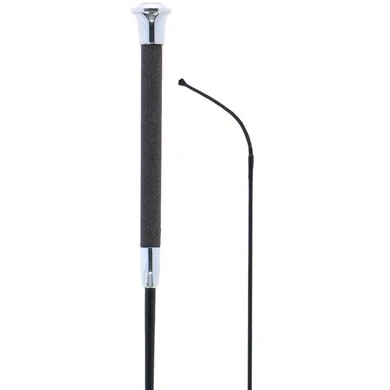 Dressuurzweep met een fiberglas kern en een zwarte stok. De speciale coating zorgt voor een lichte glans en langere levensduur. Ook het klapkoordje (10 cm) is door de verstevigende coating extra duurzaam. De zweep heeft een opvallende handgreep omwikkeld met antislip glittermateriaal en een luxe zilverkleurige knop.