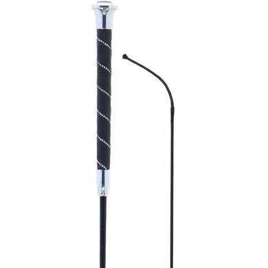 Dressuurzweep met een fiberglas kern en een zwarte stok. De speciale coating zorgt voor een lichte glans en langere levensduur. Ook het klapkoordje (10 cm) is door de verstevigende coating extra duurzaam. De zweep heeft een lederen handgreep met imitatiediamanten en een luxe zilverkleurige knop.