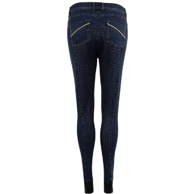 Deze stijlvolle, donkere jeans rijbroek is gemaakt van een comfortabele 4-way stretchstof en gedecoreerd met goudkleurige sierkettingen en okerkleurig contraststiksel.