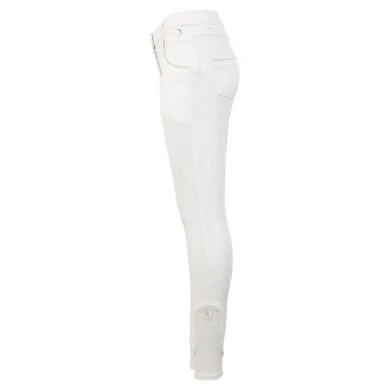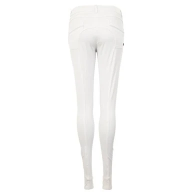 BR rijbroek Quebec dames siliconen kniestukken Deze sierlijke dames wedstrijdrijbroek valt op door de glanzende BR logo’s gemaakt van zilveren stiksel, de zilveren sluiting en de glimmende siliconenprint. De siliconen kniestukken zorgen voor extra grip. De broek is voorzien van steekzakken aan de voorkant en opgestikte zakken aan de achterkant. De randen van de zakken zijn verfraaid met zilveren sierbanden.