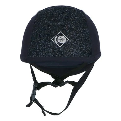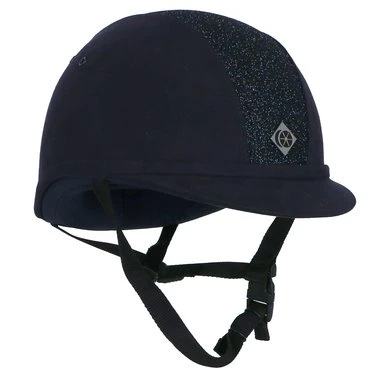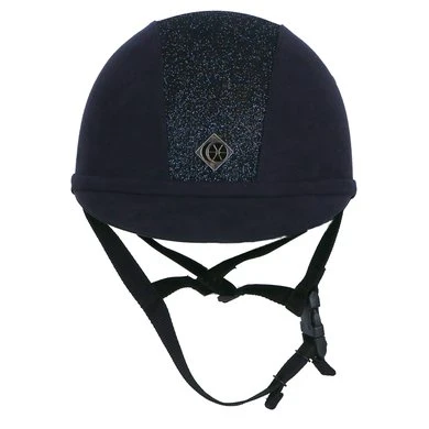 De vierpunts sluiting zorgt ervoor dat de cap stevig op het hoofd zit. Uniek aan deze helm is het sparkly middenstuk dat bijna naadloos aansluit op het suède aan de zijkanten.
