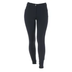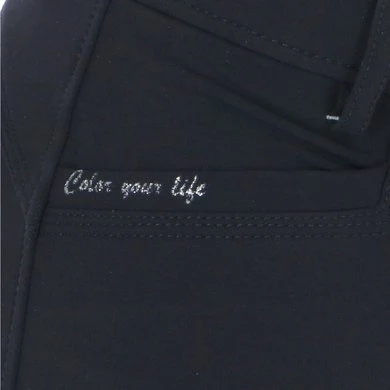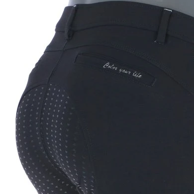 Het design voor deze fullgrip rijbroek voor dames is geïnspireerd door de populaire spijkerbroek met 4 zaken: Vier aangenaaide zakken, twee op de achterkant, twee op de voorkant terwijl de voorzakken een diagonale opening. De achterzakken zijn aangenaaid als paspelzakken. Een kleine slogan is aan de rechter achterzak vastgemaakt.