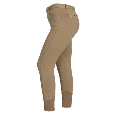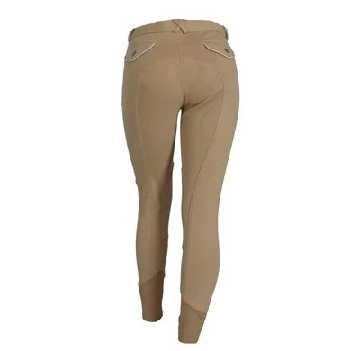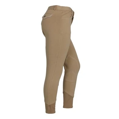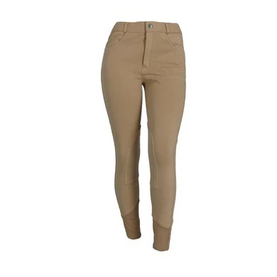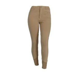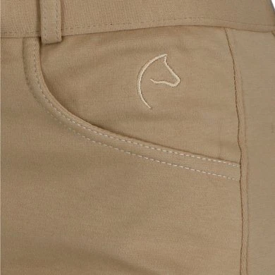 Gebreide rijbroek met elastisch onderbeen van dubbel dik elastaan waardoor ze gemakkelijker aan te trekken zijn en een stevige zit en volledig comfort garanderen. Rechte, beenomsluitende snit met voorgevormde zit en stoffen kniestukken. Westerse zakken aan de voorzijde en klepzakken met drukknoopsluiting aan de achterzijde. Antislipband met lussen, haaksluiting. Opgestikte naden en paspelzakken op de achterzakken in een contrasterende kleur. Samenstelling: 95% katoen, 5% elastaan. Machinewasbaar op 40 ° C.