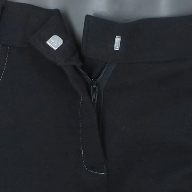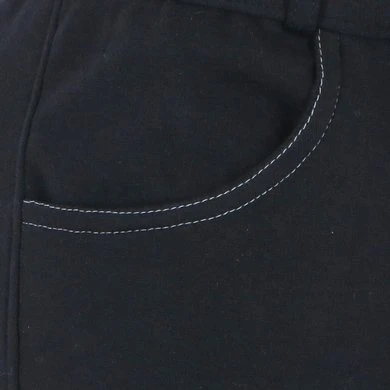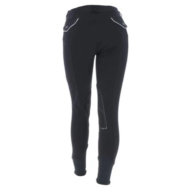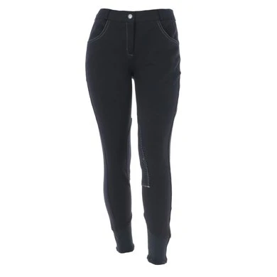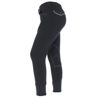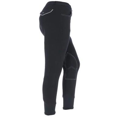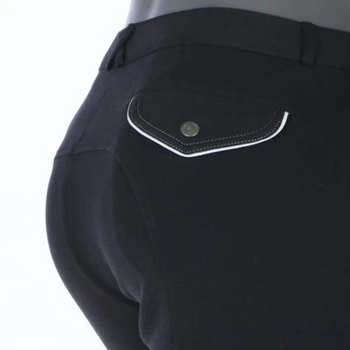 Gebreide rijbroek met elastisch onderbeen van dubbel dik elastaan waardoor ze gemakkelijker aan te trekken zijn en een stevige zit en volledig comfort garanderen. Rechte, beenomsluitende snit met voorgevormde zit en stoffen kniestukken. Westerse zakken aan de voorzijde en klepzakken met drukknoopsluiting aan de achterzijde. Antislipband met lussen, haaksluiting. Opgestikte naden en paspelzakken op de achterzakken in een contrasterende kleur. Samenstelling: 95% katoen, 5% elastaan. Machinewasbaar op 40 ° C.