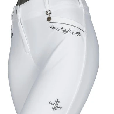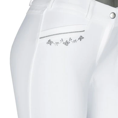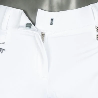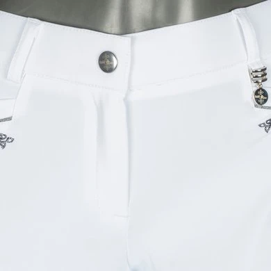 • Twee ruime voorzakken en twee imitatiezakken (in wit) versierd met discreet borduursel met kristallen