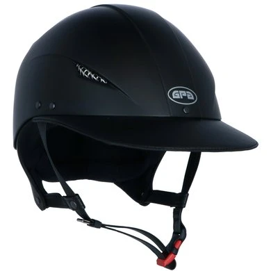 De klassieke kinband is vervangen door een hybride systeem, een nieuwe exclusieve van GPA. Een kruising tussen het twin lock-systeem en de traditionele kinriem, het achterste deel is gemaakt van thermoplastische hars en verwerkt glasvezelweefsel. De nylon riemen, bedekt met synthetisch leer, worden vastgemaakt door middel van een tweedelige gesp. Dankzij het stijve deel aan de achterkant dat de schaal verlengt, garandeert de hybride kinband een uitgebreidere bescherming en betere ondersteuning van de helm op het hoofd. Dankzij het stijve deel aan de achterkant dat de schaal verlengt, garandeert de hybride kinband meer uitgebreide bescherming en een betere grip van de helm op het hoofd.