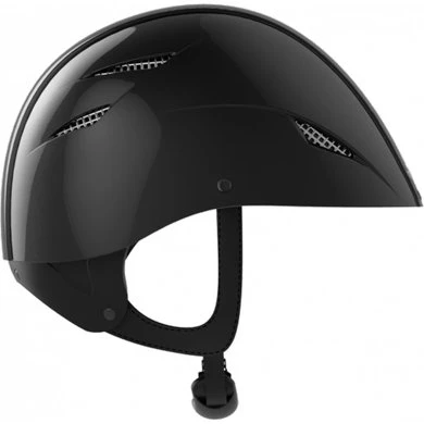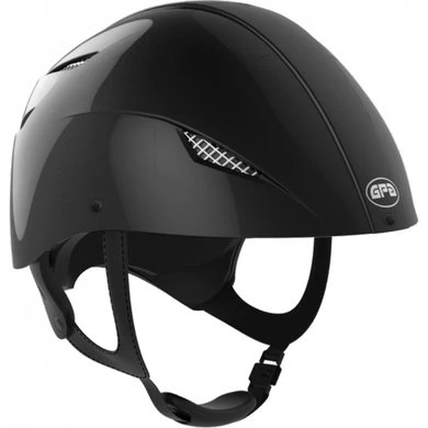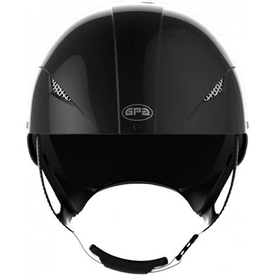 De klassieke kinriem is vervangen door een hybride systeem, exclusief voor GPA. Een kruising tussen het dubbele vergrendelingssysteem en de traditionele kinband, het achterste deel is gemaakt van thermoplastische hars en ingebouwd glasvezelweefsel. De nylon riemen, bedekt met synthetisch leer, sluiten door middel van een tweedelige gesp. Dankzij het stijve deel aan de achterkant dat de schaal verlengt, garandeert deze hybride kinband meer bescherming en een betere grip van de helm op het hoofd.Helmschaal 1: Maten 53 – 56 cm