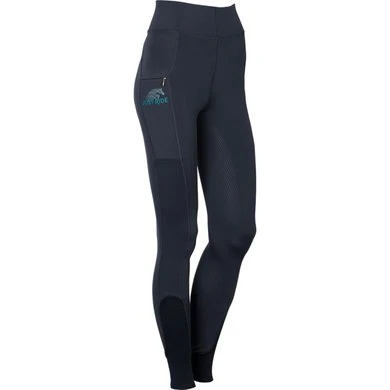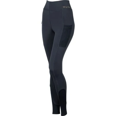 Hippe paardrijlegging voorzien van rondgenaaid zitvlak met een siliconen print voor extra grip in het zadel, twee mesh zakjes aan de linkerkant en een zakje aan de rechterkant met ritssluiting en het Just Ride logo, lycra flexlegs voor extra comfort in de rijlaarzen