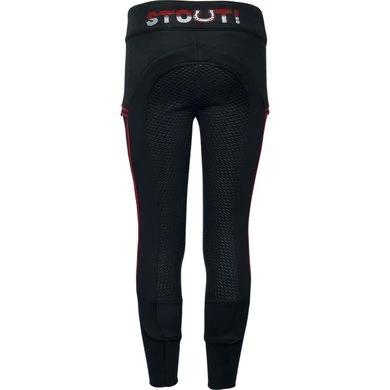 Hippe paardrijlegging. Zeer comfortabele en stretchy stof, pull-up model met STOUT! logo, contrast pipings, rondgenaaid zitvlak met siliconen voor extra grip in het zadel, lycra flex