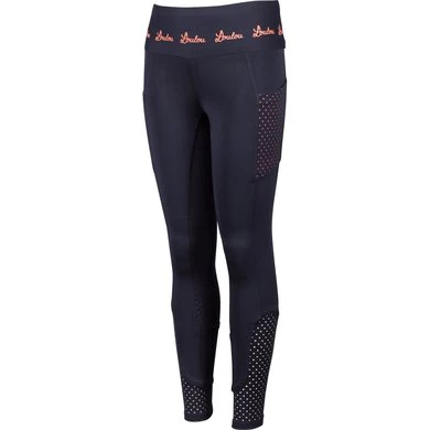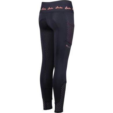 Rijlegging met print op de tailleband, twee zakken aan de zijkant met lasercut design, rondgenaaid zitvlak met siliconen print voor extra grip in het zadel en met elastische inzet rond de enkels voor extra comfort in de rijlaarzen.