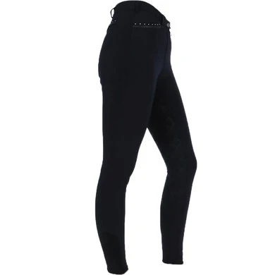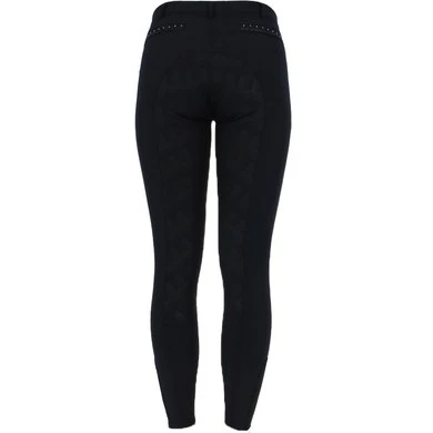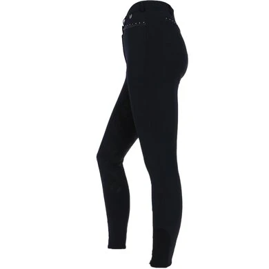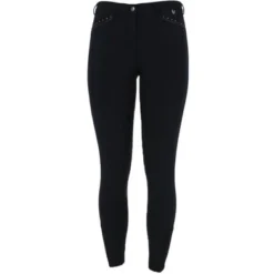 De Alexa is een damesrijbroek van comfortabel micropolyester. De broek heeft een flatterende pasvorm en een middelhoge tailleband. Subtiele glittertape en kristallen steentjes geven het een verfijnde uitstraling. De broek heeft twee voorzakken met ritssluiting, diep genoeg om een mobiele telefoon op te bergen, en twee nep achterzakken. Een matte siliconen zitvlak zorgt voor een goede grip in het zadel.