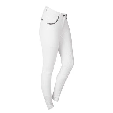 De Nicola is een elegant ontworpen rijbroek uit zeer technische Super X-stof. Waterafstotend, vocht afvoerend en ademend. Glittertape op achterste riemlussen en op de voor- en achterzakken, en subtiel geprinte siliconen zitvlak delen maken deze rijbroek een must, zowel voor casual rijden als voor show.