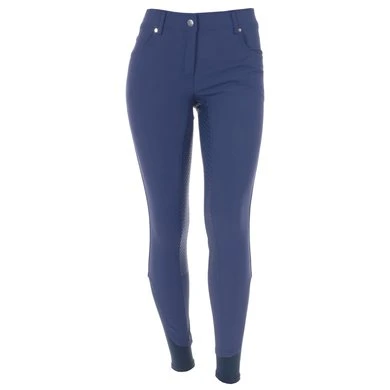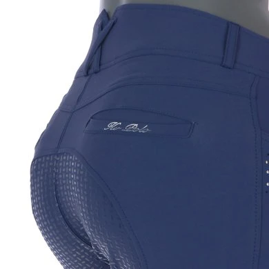 Luxe rijbroek met extra hoge tailleband aan de achterkant. Met fancy strass-steentjes onder de voorzakken en logostrass-steentjes op de paspelzak achter.