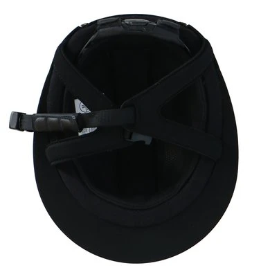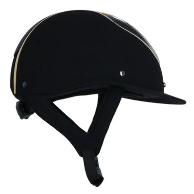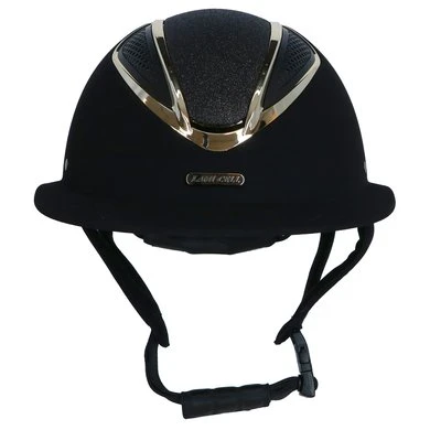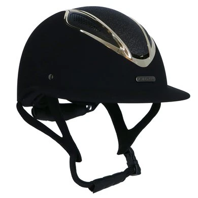 Stijlvolle en hoogwaardige met PU fluweel beklede helm, verstelbaar en met 2 uitneembare voeringen. Glanzend gun metal inzetstuk/ABS buitenschaal/Polypropyleen klep, EPS voering, comfort pads en polyester banden & gesp bevestigingssysteem. EPS/EN 1384:2012 zoals gewijzigd door VG1 01.040 2014-12. Certificering SGS FIMKO OY