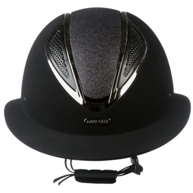 Stijlvolle en hoogwaardige met PU fluweel beklede helm, verstelbaar en met 2 uitneembare voeringen. Glanzend gun metal inzetstuk/ABS buitenschaal/Polypropyleen klep, EPS voering, comfort pads en polyester banden & gesp bevestigingssysteem. EPS/EN 1384:2012 zoals gewijzigd door VG1 01.040 2014-12. Certificering SGS FIMKO OY