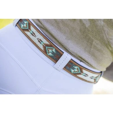 De Pearl riem is van leer met inzetstukken bekleed met kralen. De patronen variëren afhankelijk van de kleur van het leer. Samenstelling: rundleer, roestvrijstalen gespen en ringen.