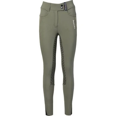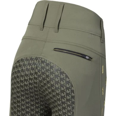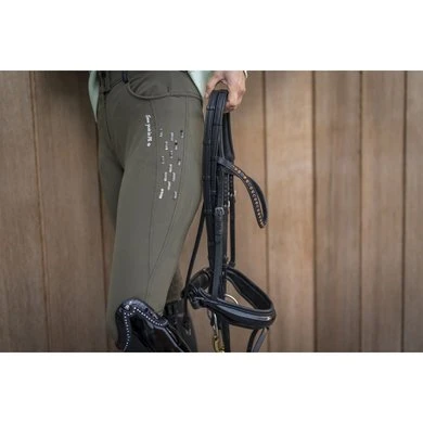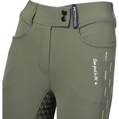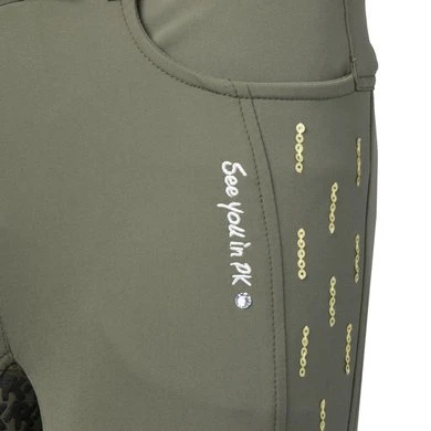 Deze technische rijbroek heeft een echte PK look en is voorzien van een wat hogere band, twee steekzakken aan de voorzijde en een gouden rits aan de achterzijde. Aan de zijkant van de broek zitten verschillende sequins. Dit model broek is uitgevoerd in vier verschillende kleuren en bevat een siliconen zitvlak of siliconen kniegrip.