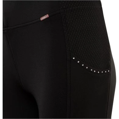 Het 4-way-stretchmateriaal, de elastische tailleband zonder sluiting en het meshmateriaal zorgen samen voor een nauwsluitende pasvorm en een hoge mate van comfort. De broek bevat op ieder been een diepe zijzak die geschikt is om je mobiele telefoon in te doen. De linkerzak is stijlvol afgewerkt met imitatiediamanten.